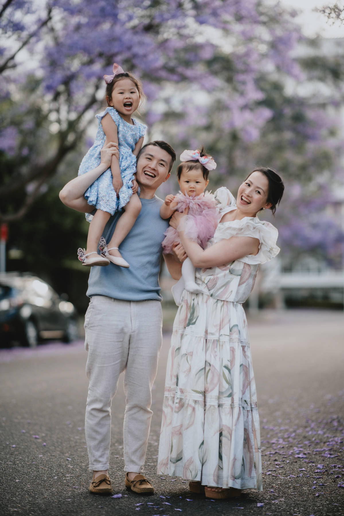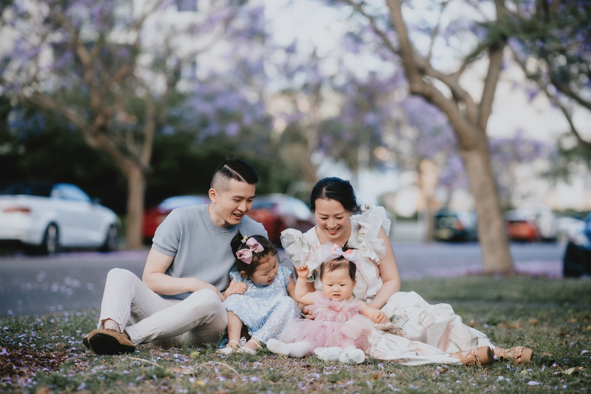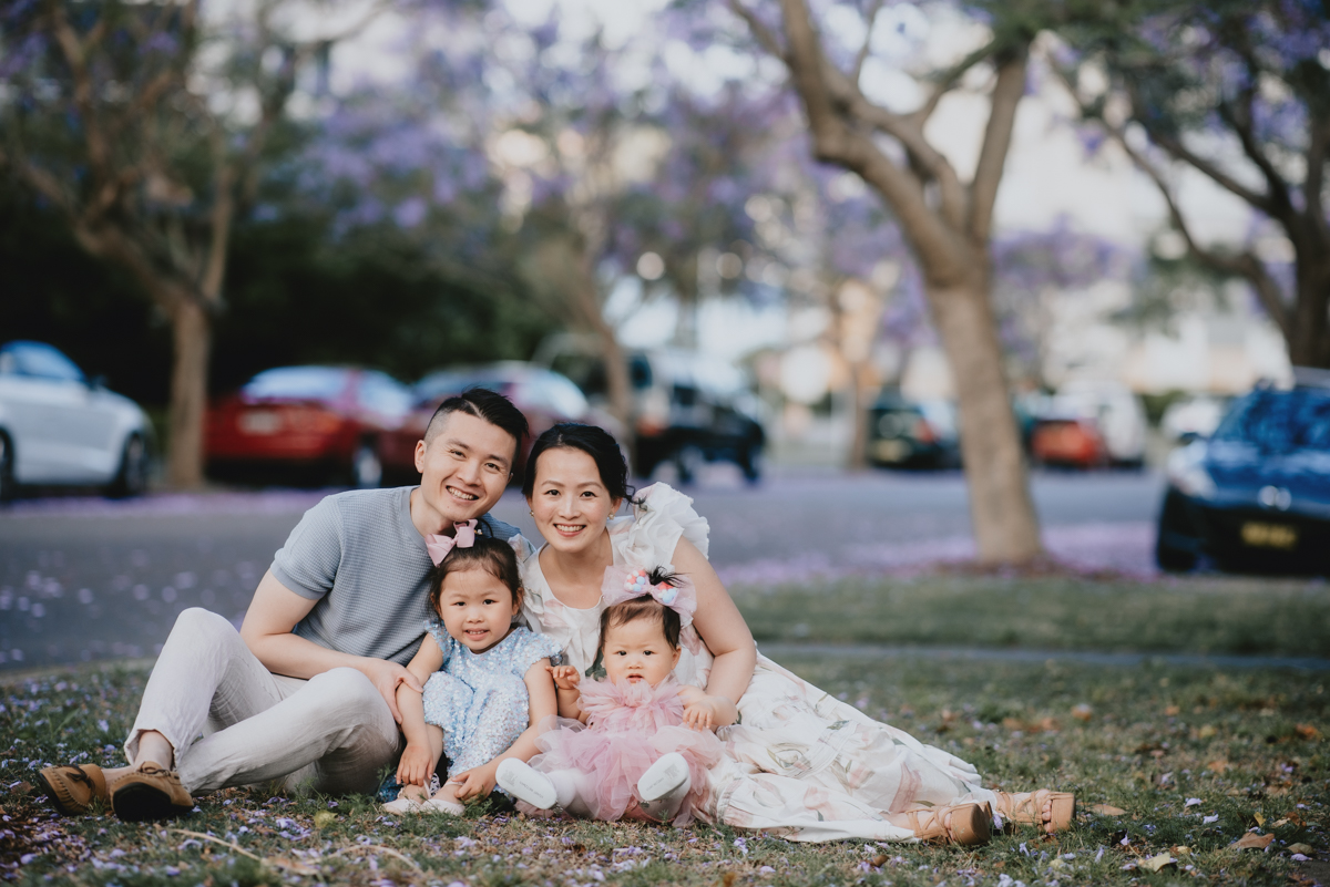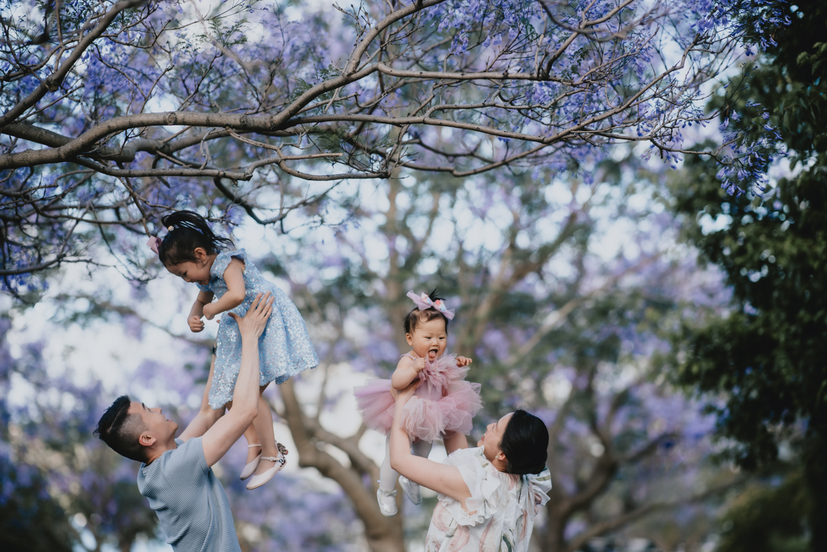 Jacaranda season in Sydney is so spectacular! For a month the skies over Sydney’s suburban street turn into pastel purple. You do not want to miss it! What better backdrop is there for a family portrait session than these magical Jacaranda blossom skies?
